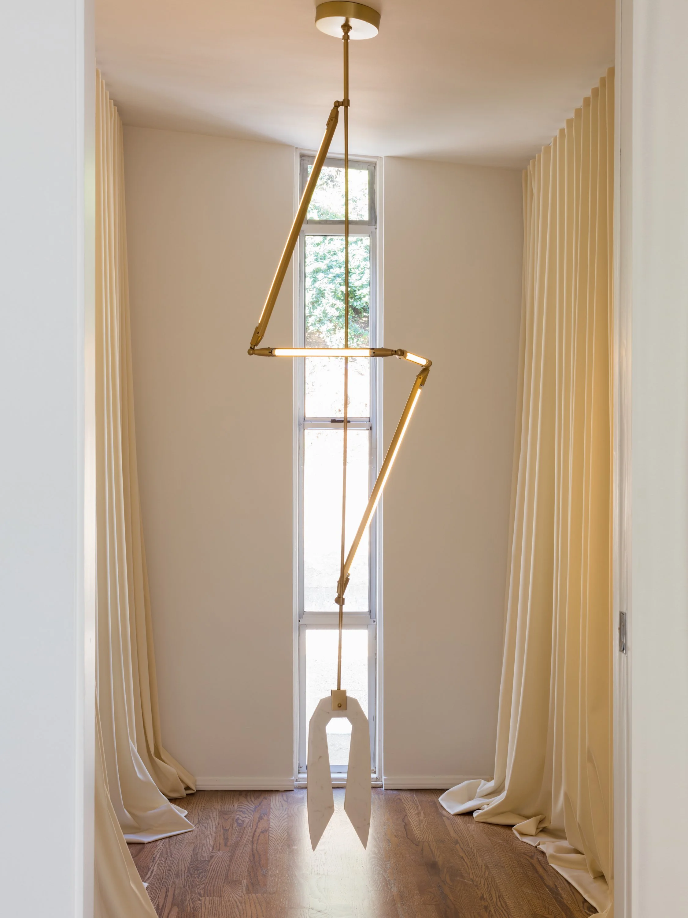 Helix is composed of custom brass hardware and LED tubes that wrap around a central support in a lean, angular composition. Helix is available with a stone counterweight for hanging fixtures, and in any of our standard brass finishes.