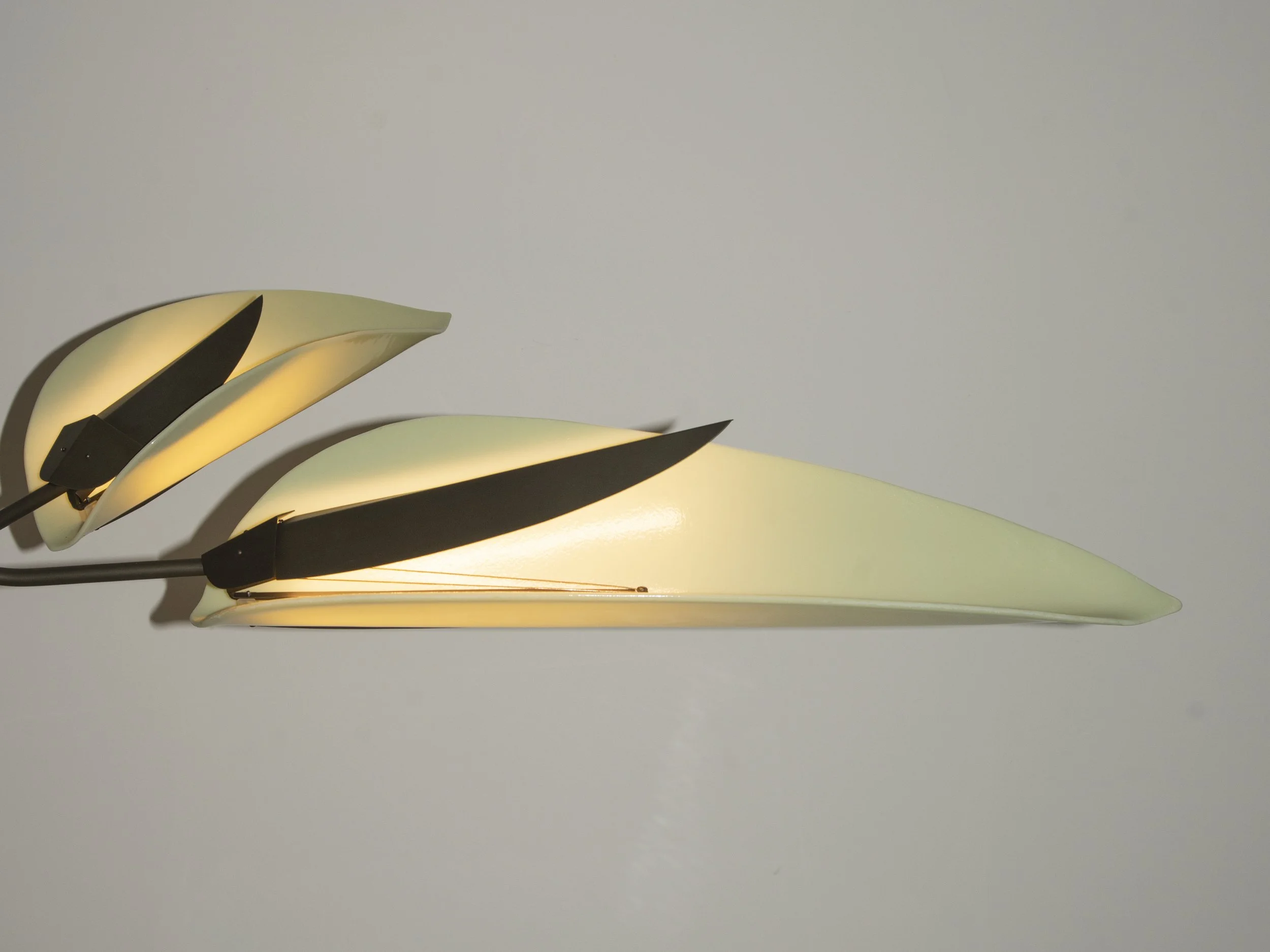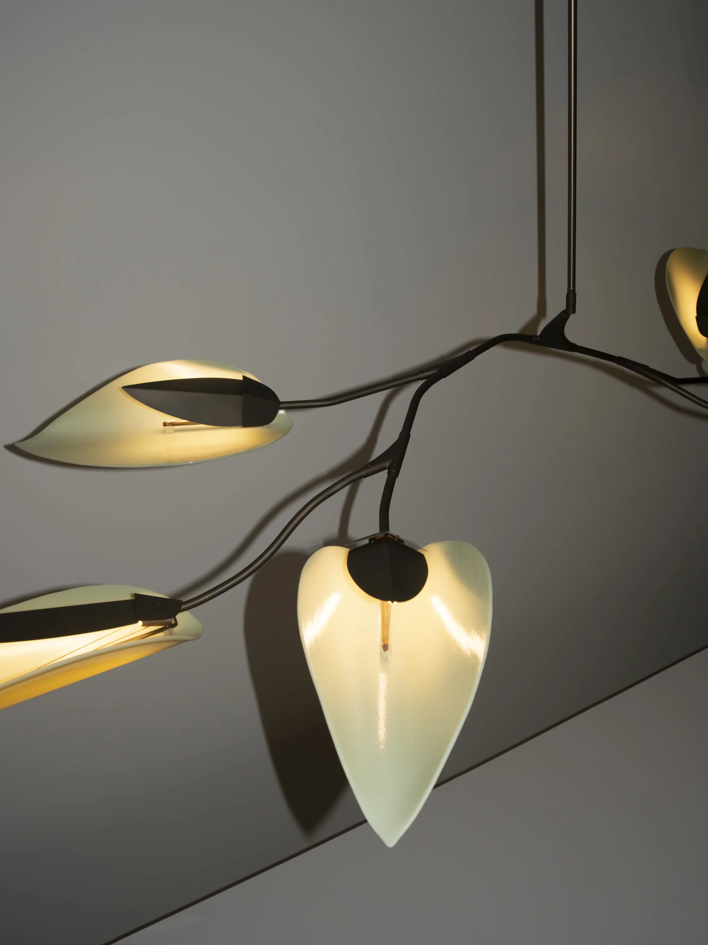 Unfurl eloquently captures the organic gestures of nature. With its elegant design, Unfurl features glass diffusers resembling delicate leaves, suspended gracefully by gently bent brass tubes; the nesting leaf-shaped reflectors cradle the stamen-like light. This piece is a testament to the beauty found in simplicity and the intricate dance of the botanical world.
